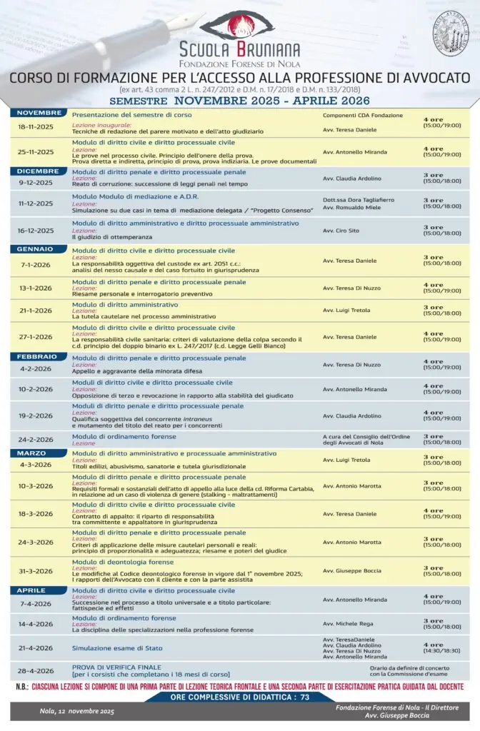 Newsletter n. 405 del 18.11.2025Con riferimento all’oggetto, si comunica che oggi inizia il corso obbligatorio dl formazione per l’accesso alla professione dl Avvocato organizzao dalla Scuola Bruniana – Fondazione Forense di Nola:18.11.2025 | PRESENTAZIONE DEL SEMESTRE DI CORSO | dalle ore 15,00 all