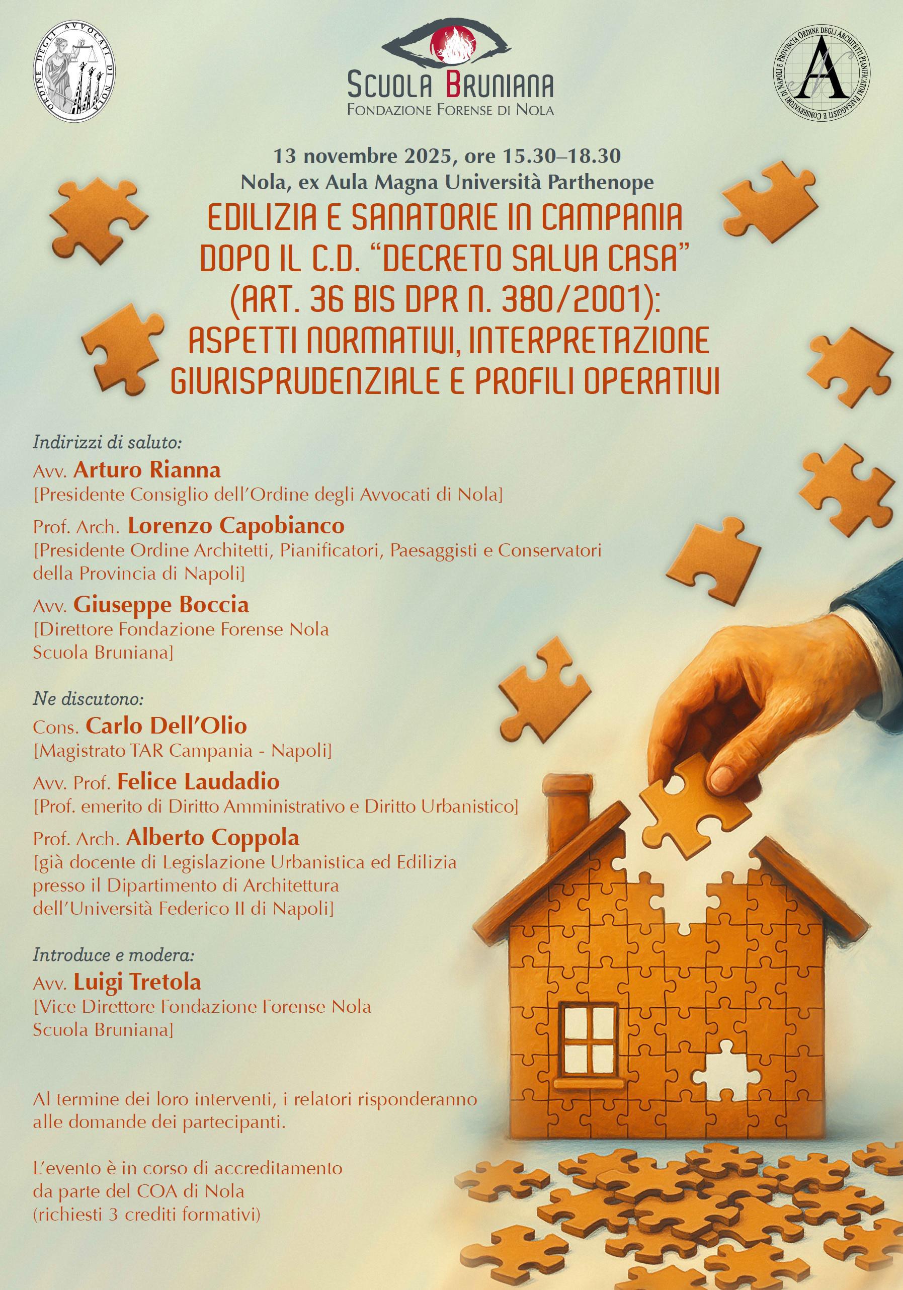 che si terrà giovedì 13 novembre 2025, alle ore 15 e 30 presso l'Aula Magna dell'ex Università, organizzato dalla Fondazione Forense di Nola, in sinergia con COA Nola e Ordine Architetti Napoli: